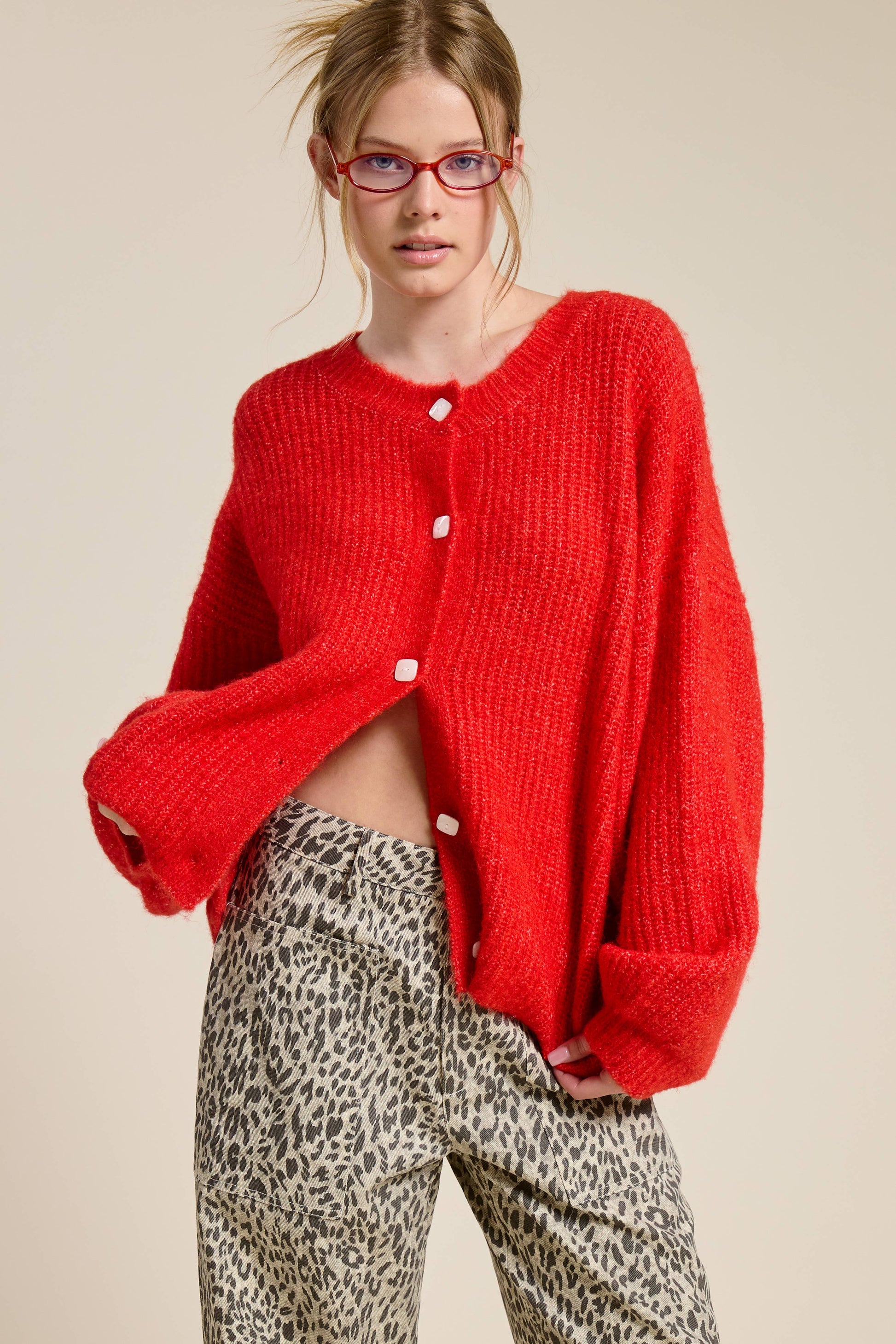 Crafted from a plush, textured knit, this oversized cozy cardigan features a ribbed round neckline and cuffs, exaggerated drop shoulders, a square button-up front, and balloon sleeves for an effortlessly relaxed silhouette. Complete with a regular-length fit, this chunky cardigan offers warmth with a modern edge.